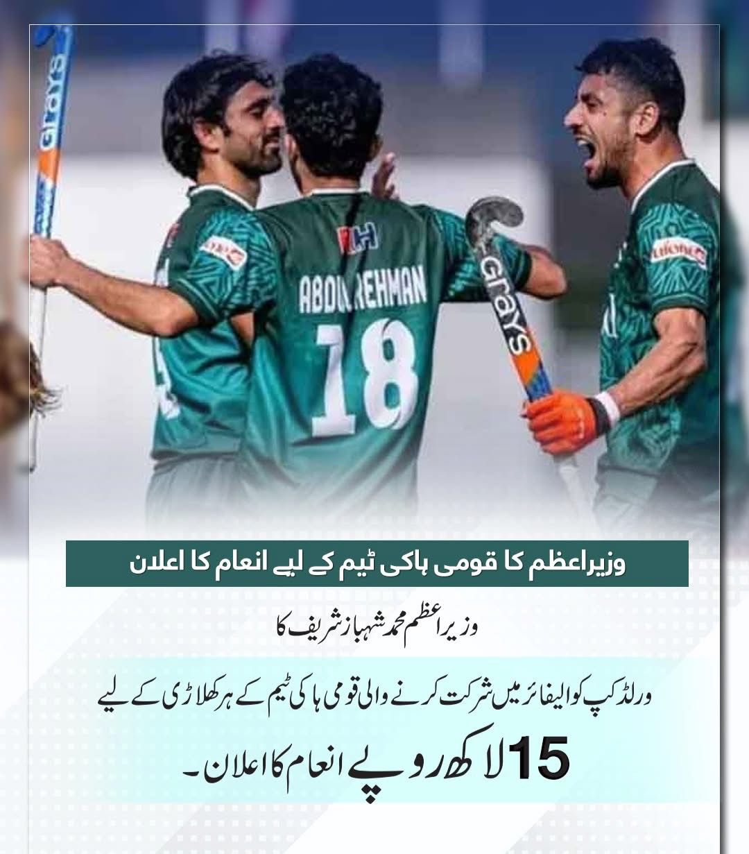 وزیراعظم شہباز شریف نے ورلڈ کپ کوالیفائر میں شرکت کرنے والی قومی ہاکی کھلاڑیوں کی شاندار کارکردگی کے اعتراف میں ٹیم کے ہر کھلاڑی کیلئے 15 لاکھ روپے انعام کا اعلان کیا ہے۔
